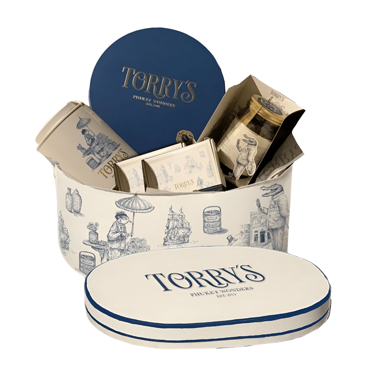 Gift ideas set 2 Oval box includes: 1 large box of Classic & Salted Phuket cookies & macadamia (12 pieces), 1 large box of Mooncake biscuit Pineapple (5 pieces), 1 small box of Bean puff sweet (6 pieces), and 1 box of Sweet & spicy shrimp paste dipping sauce.